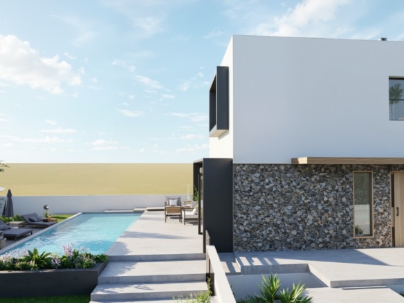 Modern villas under construction in Souni near Limassol. The project includes 11 contemporary homes surrounded by pine forests with coastal views. Located 15 km from Limassol city center and 7 km from Curium Beach. Energy Efficiency Class A, photovoltaic panels, underfloor heating, and private swimming pool included. Estimated delivery for Houses 5–9: 14 months.